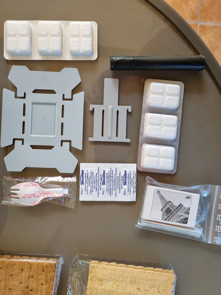 Francuskie racje żywnościowe całodobowe. To te najlepsze na rynku. Prawie dwa kilogramy dobra, w tym: dwa posiłki główne, zupa, muesli, czekolada, dwa batony energetyczne, nugat energetyczny, żelek energetyczny, napój izotonik, paka ciasteczek, dwie kawy, dwie herbaty, konserwa mięsna małą, deser (ryż na mleku lub panna cota lub daktyle lub śliwki), kakao, dżem, cukier, kuchenka turytyczna, paliwo suche, zapałki, tabletki do odkażania wody, przyprawy, paczka chusteczek, worek na śmieci, widelczyk.