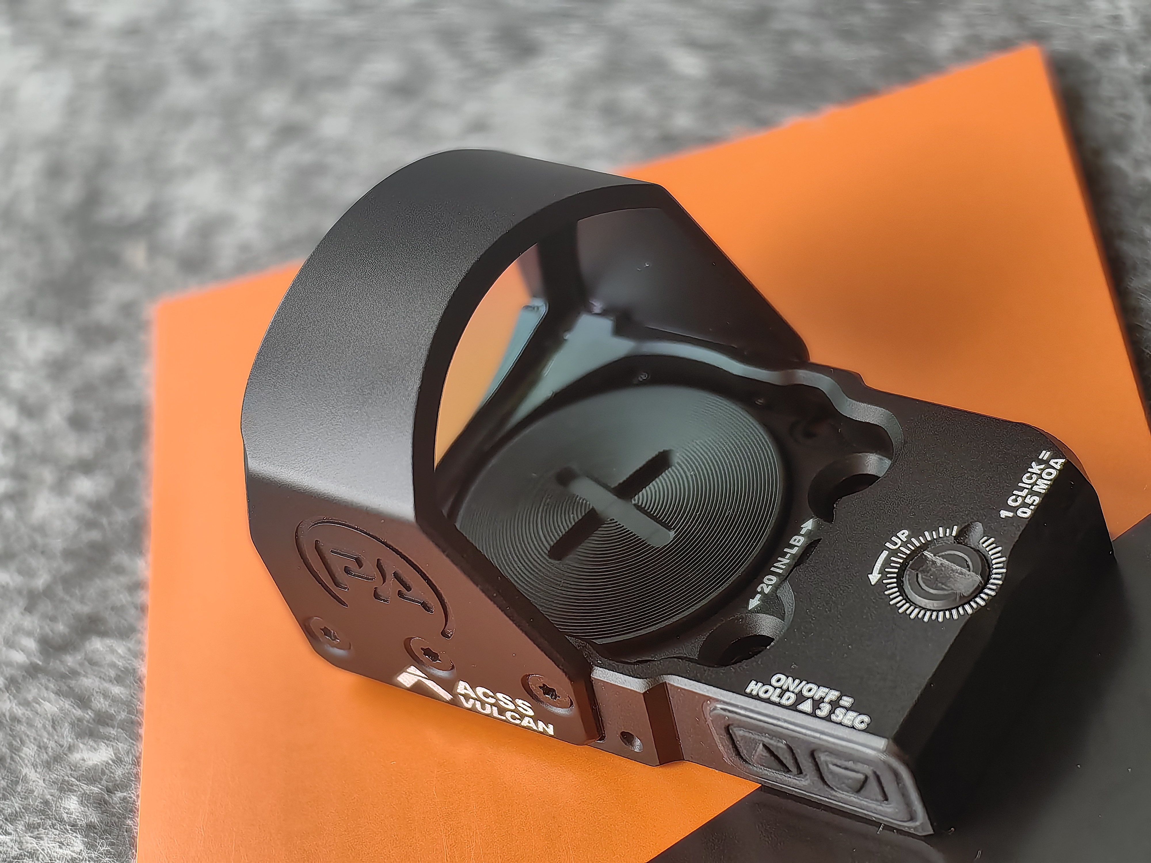 Najbardziej innowacyjnym i jednocześnie najbardziej praktycznym elementem tego celownika jest siatka celownicza ACSS VULCAN Dot . Została ona tak zaprojektowana, aby rozwiązać jeden z największych problemów początkujących strzelców – gubienie kropki w momencie wyciągania broni lub szybkiej zmiany postawy. Siatka składa się z wyraźnej, dużej podkowy otaczającej niewielką kropkę 3 MOA. Kiedy celownik jest w idealnej osi celowania, widzimy tylko precyzyjną kropkę. Gdy jednak broń jest nieznacznie przechylona, podkowa wchodzi w pole widzenia, natychmiast wskazując nam, w którą stronę należy skorygować ułożenie broni, aby odnaleźć kropkę. To rozwiązanie to prawdziwy game-changer. Nie musimy już marnować cennych ułamków sekund na "szukanie celu" – ACSS VULCAN Dot po prostu prowadzi nas do niego intuicyjnie. Dzięki temu strzelec może skupić się na tym, co naprawdę istotne, czyli na samym celu.