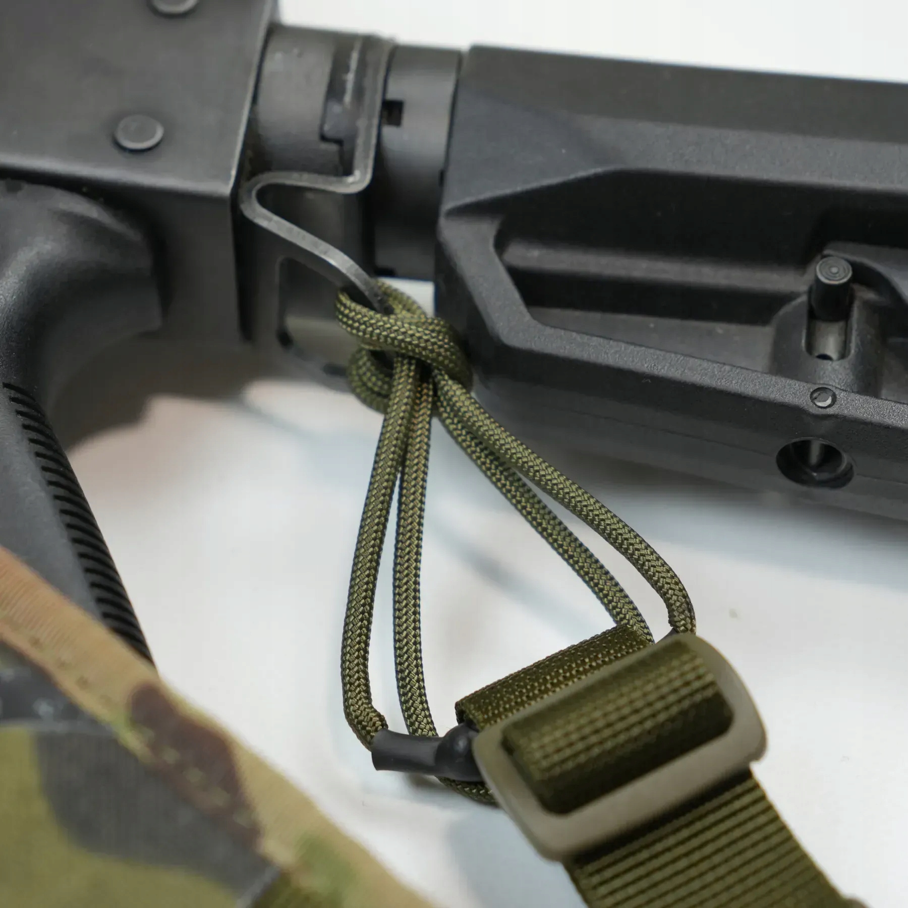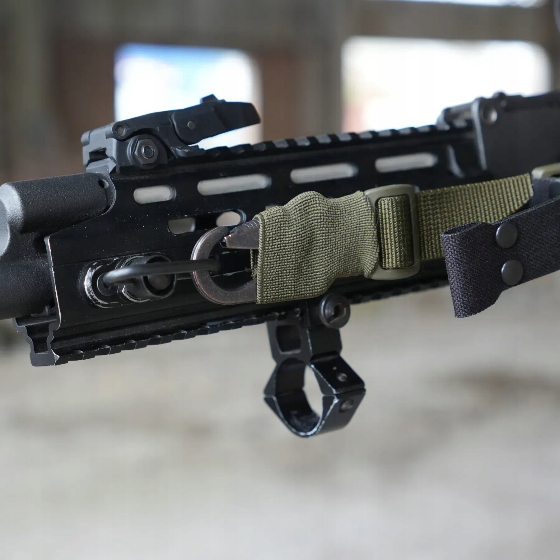 Umożliwia pracę obiema rękami, zapobiegając otarciom szyi, które mogą występować przy użyciu innych pasów. Mocowany za pomocą karabińczyka w stylu H&K, umożliwiającego szybkie odłączenie od broni.