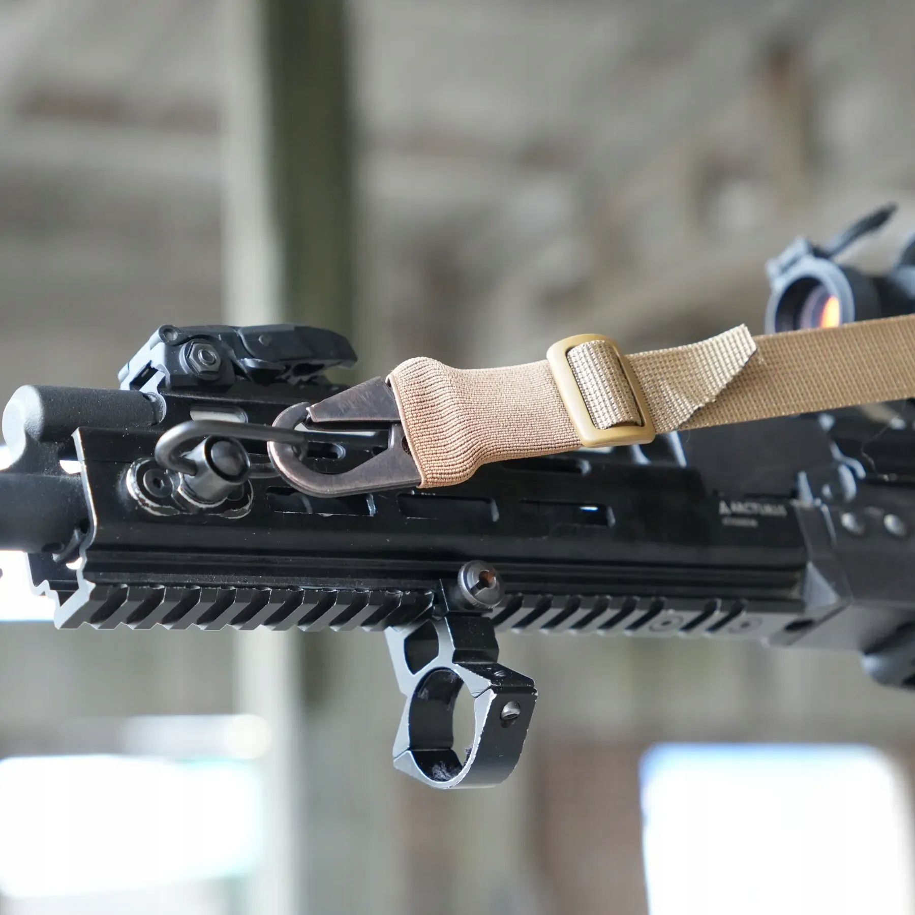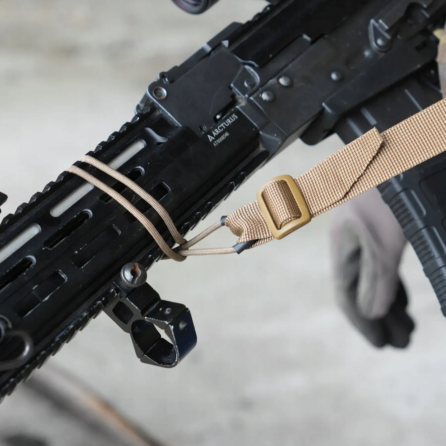 Umożliwia pracę obiema rękami, zapobiegając otarciom szyi, które mogą występować przy użyciu innych pasów. Mocowany za pomocą karabińczyka w stylu H&K, umożliwiającego szybkie odłączenie od broni.