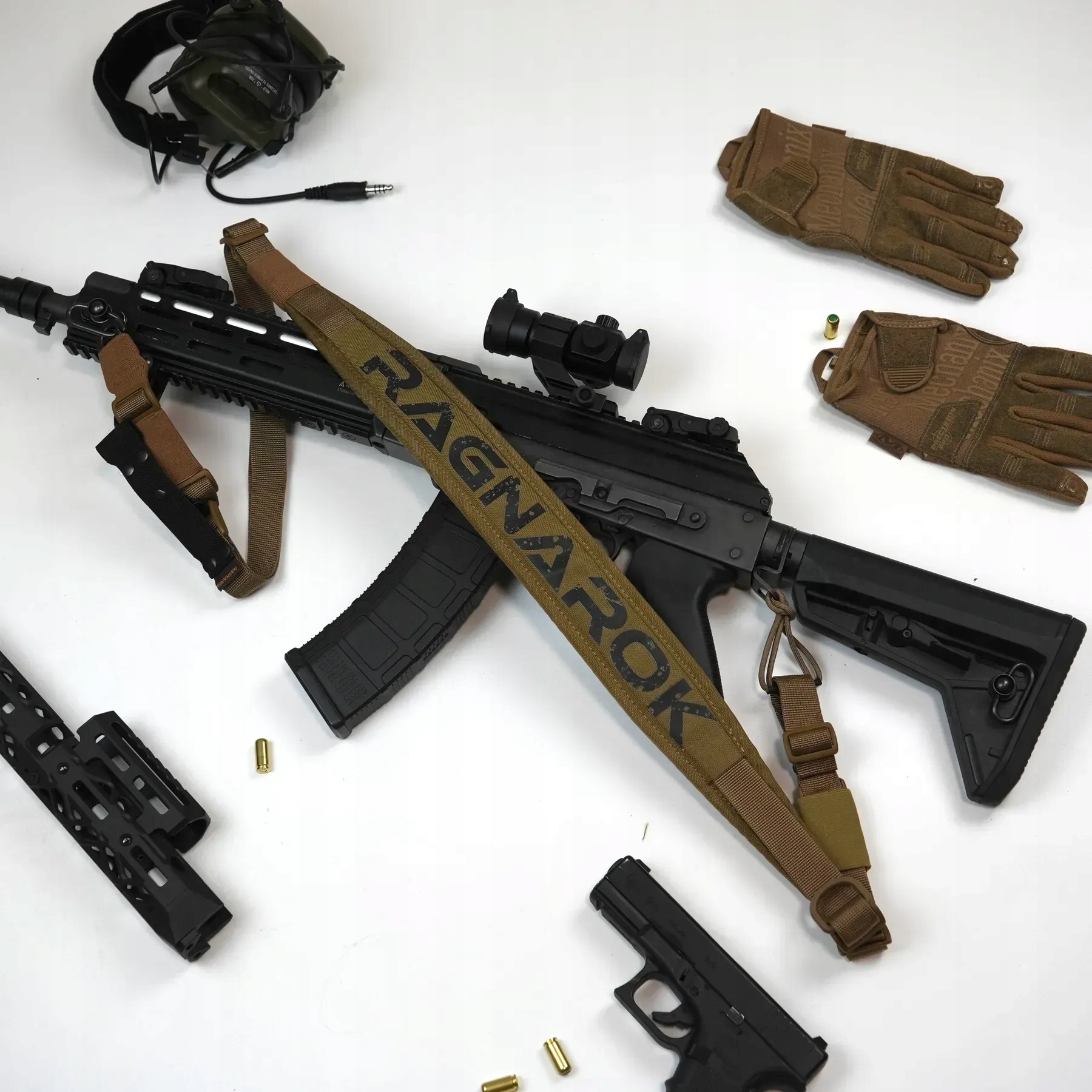 Pas Ragnarok w kolorze KOYOT wykonany jest z nylonowej taśmy o splocie oraz plecionej gumy lotniczej. Jest to w pełni regulowany pas jedno-punktowy do broni, który mocuje się za pomocą klamry w kształcie litery T do każdego kamizelki, oporządzenia lub pancerza kompatybilnego z systemem MOLLE.